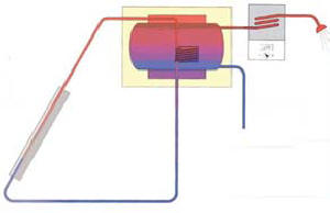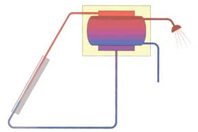 All'interno del sistema un fluido termovettore di acqua e glicole scaldandosi sale per convezione verso l'accumulo di acqua sanitaria e cede il calore catturato dal sole.
