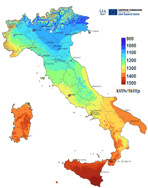 Utilizzando la mappa di irradiazione solare annua possiamo notare che in Italia sulla fascia con 1200 kWh/m2/ anno, quindi al nord, occorrono solo 2,8 mq di superficie per scaldare un bollitore da 200 litri di acqua, da 15 °C a 55°C in un ora.